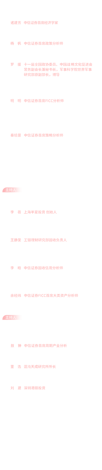 4、投资策略会内容的知识产权归属于中信证券股份有限公司,禁止投资者将投资策略会的内容以截屏、拍照或录制视频、音频等方式保存后向不特定对象公布、转发、转播,如发生此类问题,本公司将采取法律手段维护自身权利。